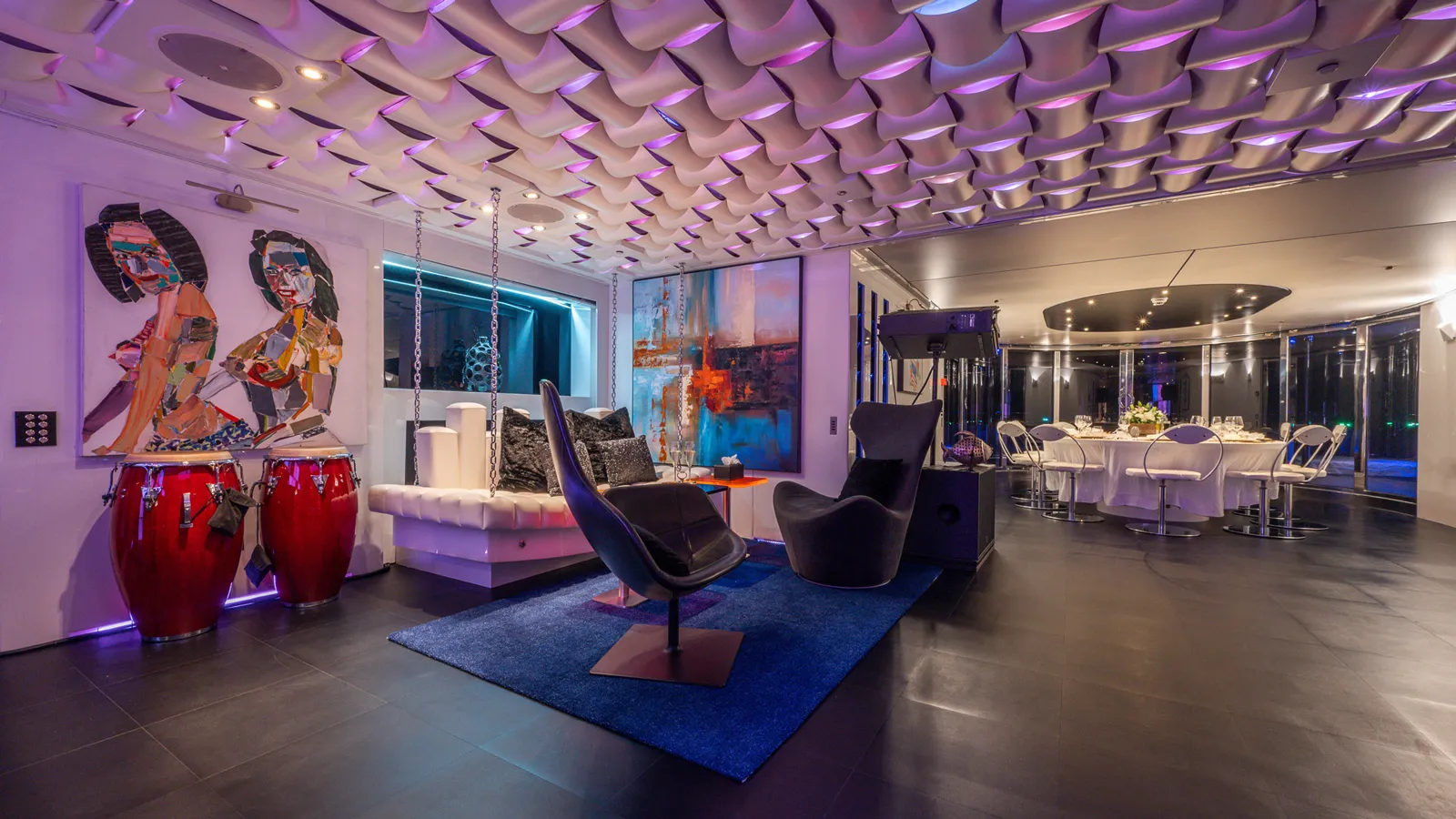 Phòng khách chính (main salon) có trần cao, tầm nhìn panorama và một quầy bar lớn. Phòng giải trí (skylounge) ở boong trên là nơi lý tưởng để thư giãn với một rạp chiếu phim mini và một quầy bar thứ hai.