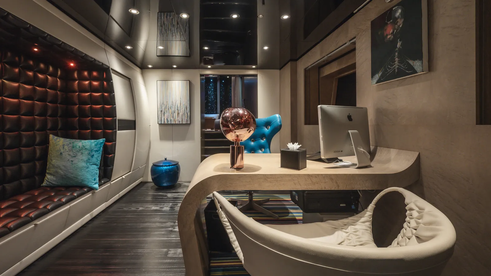 Luca Dini đã phá vỡ các quy tắc truyền thống về thiết kế du thuyền. Thay vì sử dụng các tông màu kem, be và gỗ sáng màu thường thấy, Elenoliya đi sâu vào bóng tối và sự kịch tính.