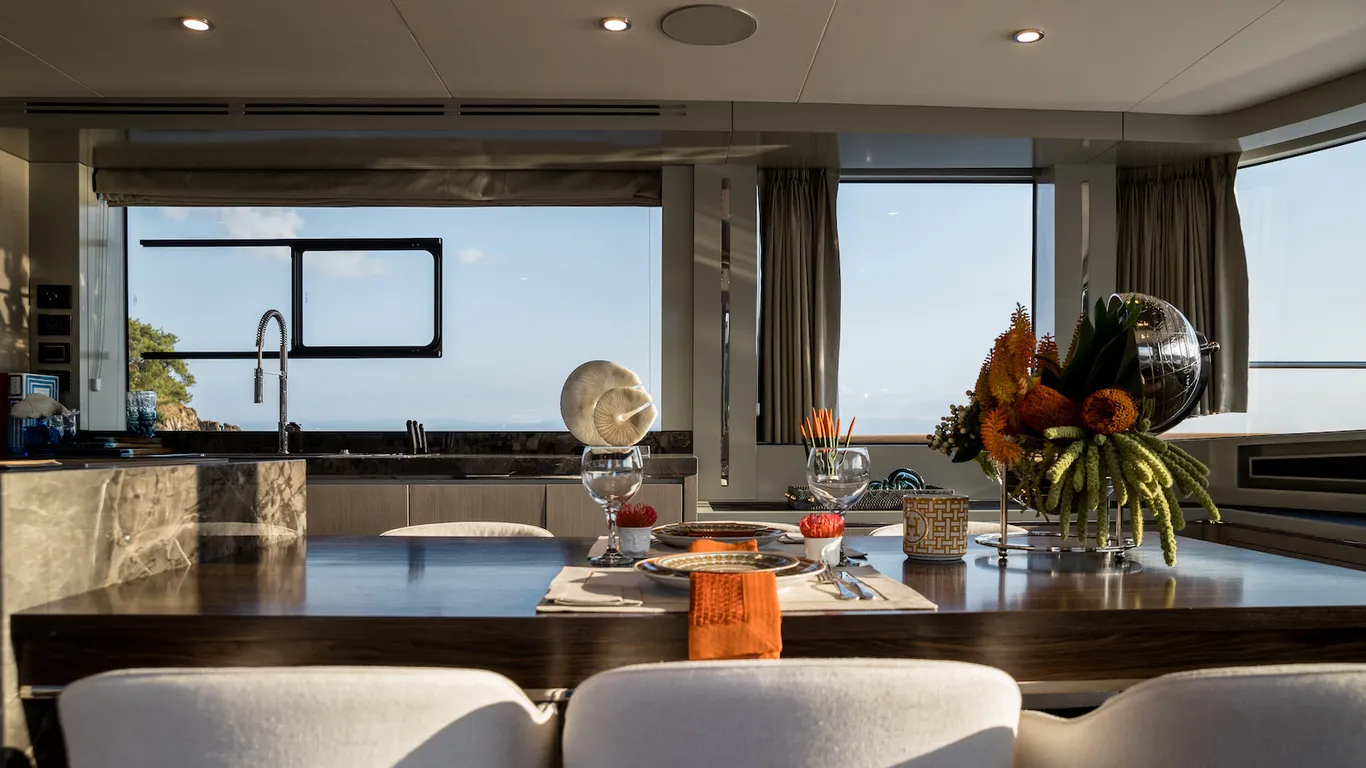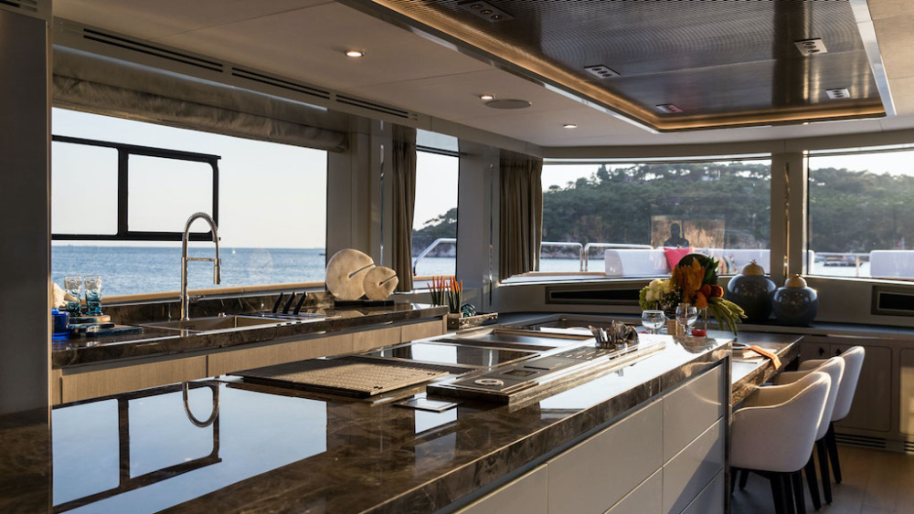 Khu vực bếp đảo trong boong chính là một điểm nhấn táo bạo góp phần tạo nên siêu phẩm Sirena 78. Phòng bếp đã được nâng tầm lên thành một không gian giải trí với bếp đảo làm trung tâm, mặt bàn dài, bồn rửa sâu và các thiết bị tiện nghi khác. Mọi thứ đều đầy đủ và được thiết kế vừa vặn. Đây là tính năng “ngôi sao” của Sirena 78 vì nó là đặc điểm được ưa chuộng nhất.