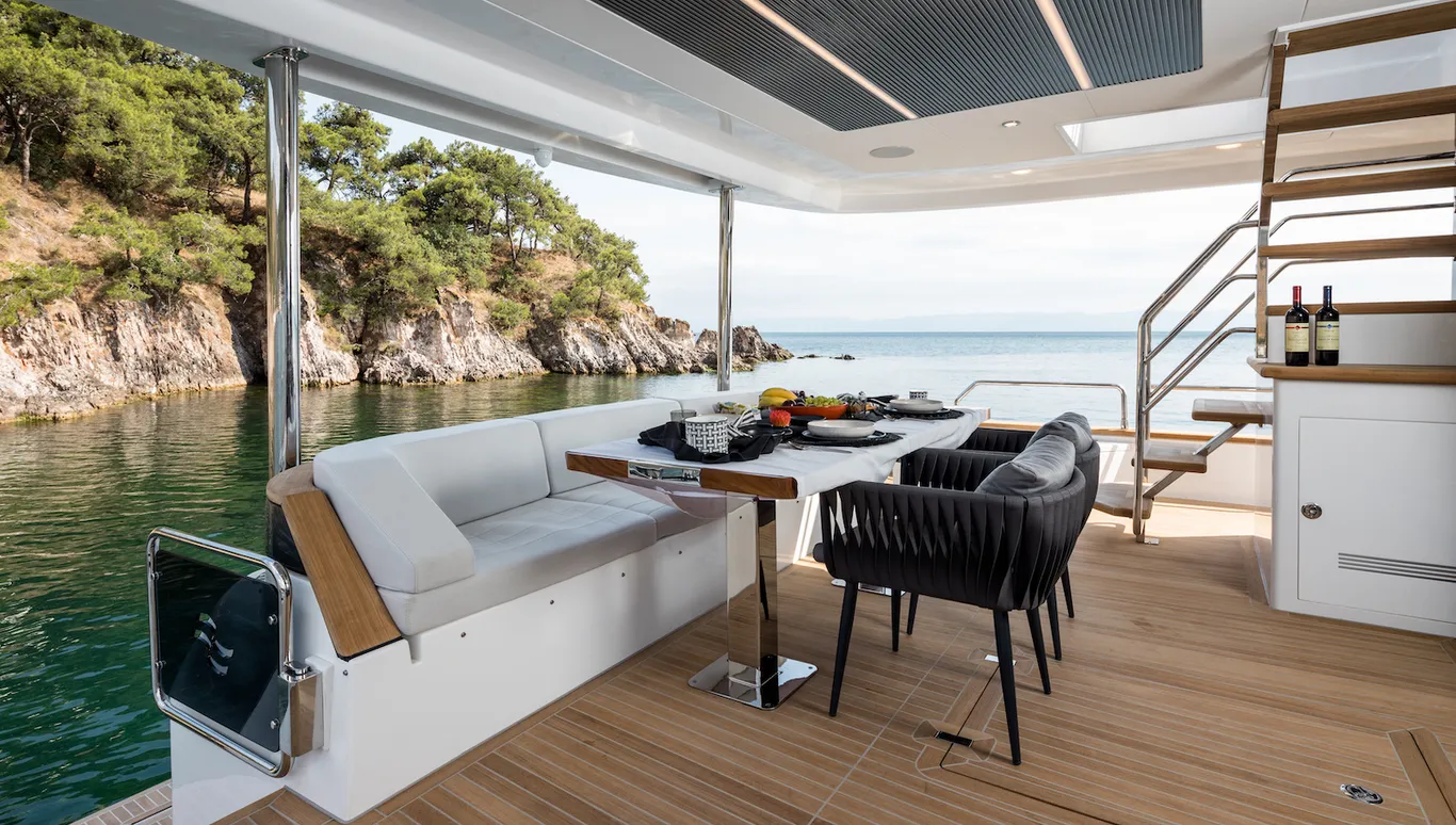 Tiếp đến là không gian dành riêng cho gia chủ nằm trên boong chính. Vì Sirena 78 không có buồng lái ở boong chính nên các không gian giải trí khác được mở rộng cực đại. Khu vực flybridge cũng là một không gian mà bất kỳ ai cũng mê mẩn. Nó được thiết kế tuỳ chọn có thể mở hoàn toàn, nửa kín hoặc đóng kín tuỳ nhu cầu.