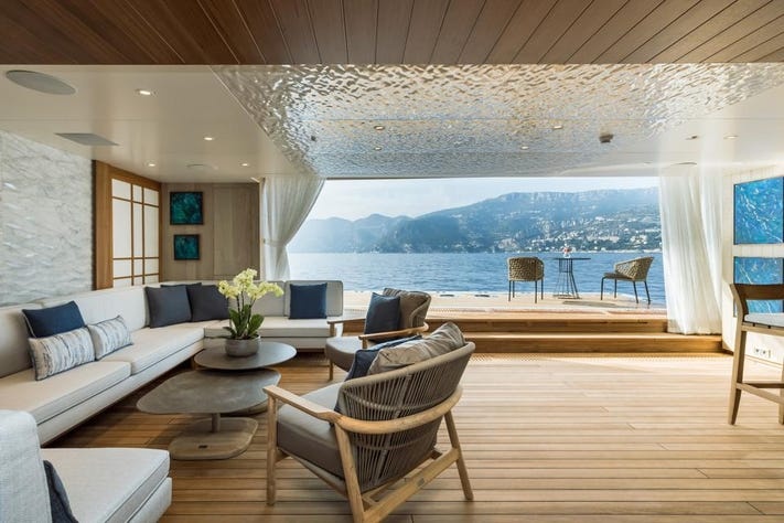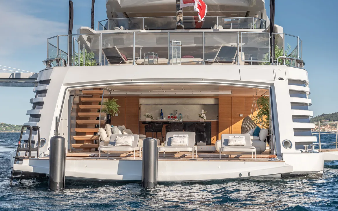 Beach club lộng lẫy rộng đến 72m2 với bản chất sang trọng hoàn hảo trong thiết kế của một chiếc siêu du thuyền. Nó được cho thuê với giá khoảng từ 700,000 EUR/ tuần.