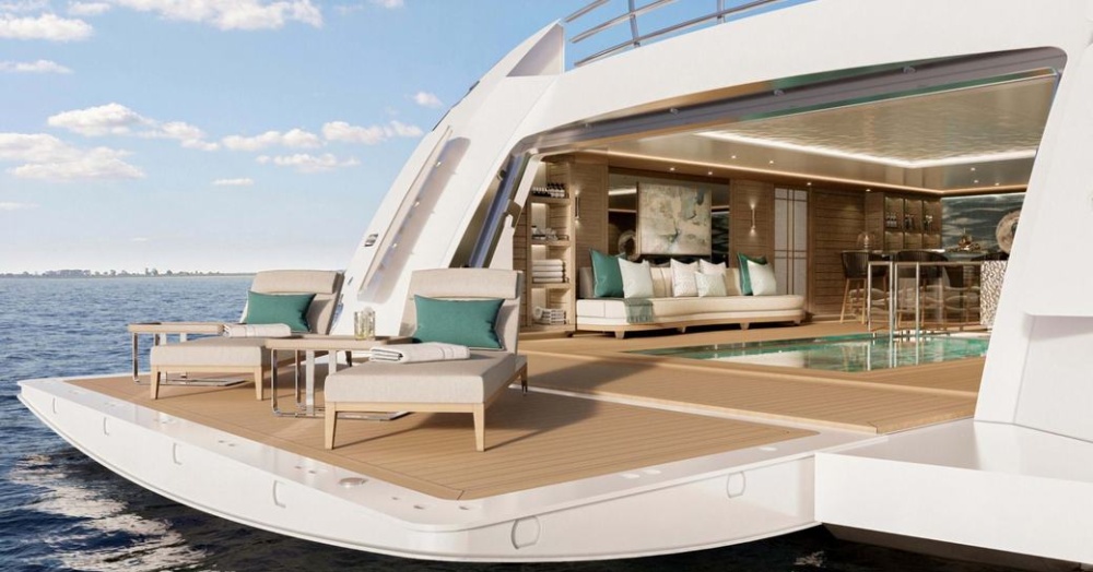 Hai cầu thang cong được thiết kế vô cùng bắt mắt dẫn xuống boong sau với bệ bơi cô định. Mang đến một không gian tách biệt để tận hưởng những tia nắng mặt trời.