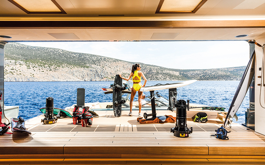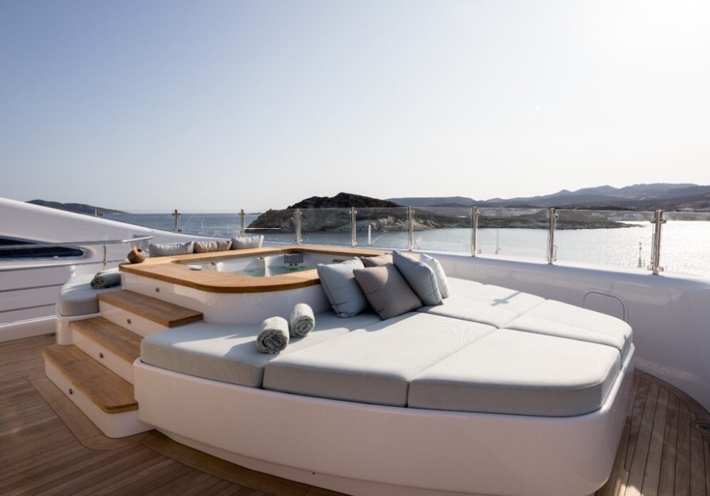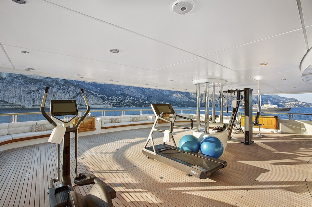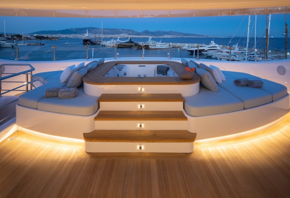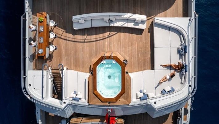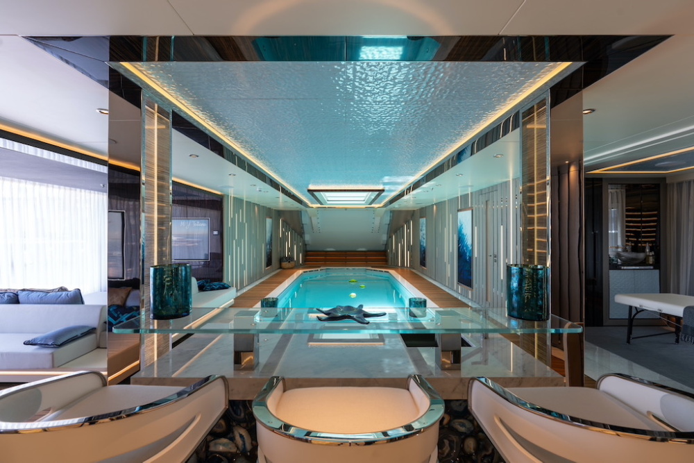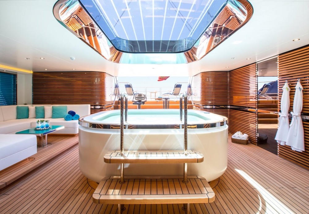Những ngạc nhiên thú vị sẽ bắt đầu được mở ra khi bạn bước xuống những bậc thang bằng gỗ tếch để vào giếng trời của beach club. Sàn nhà vị trí trung tâm được lát gạch khảm tinh xảo. Còn vách tường được làm từ gỗ tuyết tùng hiện đại. Đặc biệt, bạn sẽ thấy một bể jacuzzi lớn ở trên cao nằm phía trước. Là nơi tràn ngập ánh sáng từ khung cửa được mở phía trên. Nó được bao quanh bởi những chiếc ghế dài thoải mái. Và nhiều tiện ích chăm sóc sức khoẻ khác như spa, hammam, phòng massage. Hơn tất cả, nó có cả phòng cryo sauna đầu tiên trên thế gưới được thiết kế trên siêu du thuyền. Đây là liệu pháo giảm nhiệt độ cơ thể trong vài phút, rất hoàn hảo cho phục hồi cơ bắp và sức khoẻ.