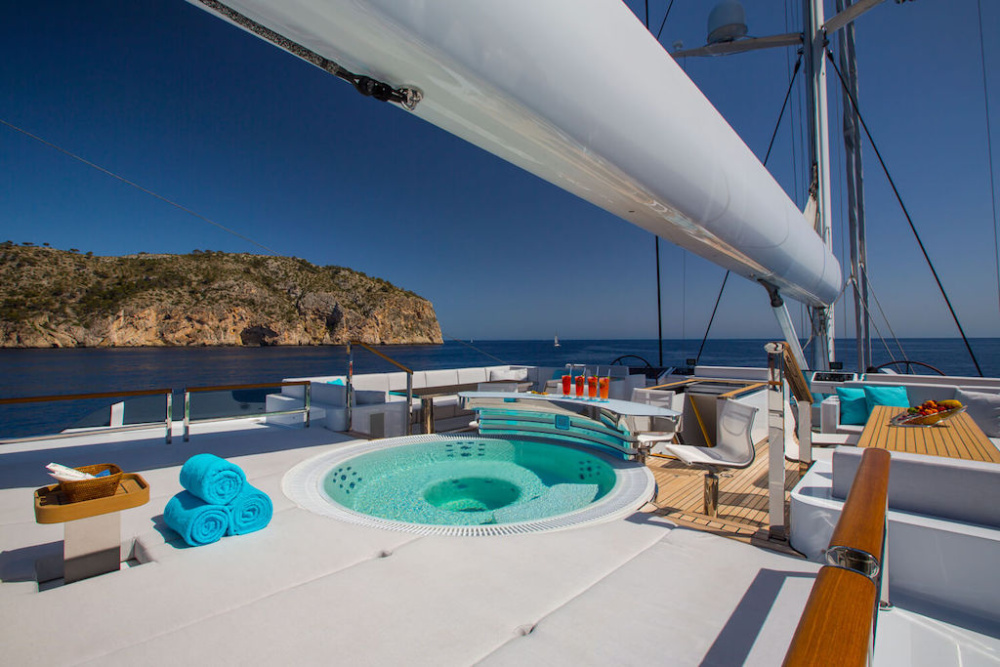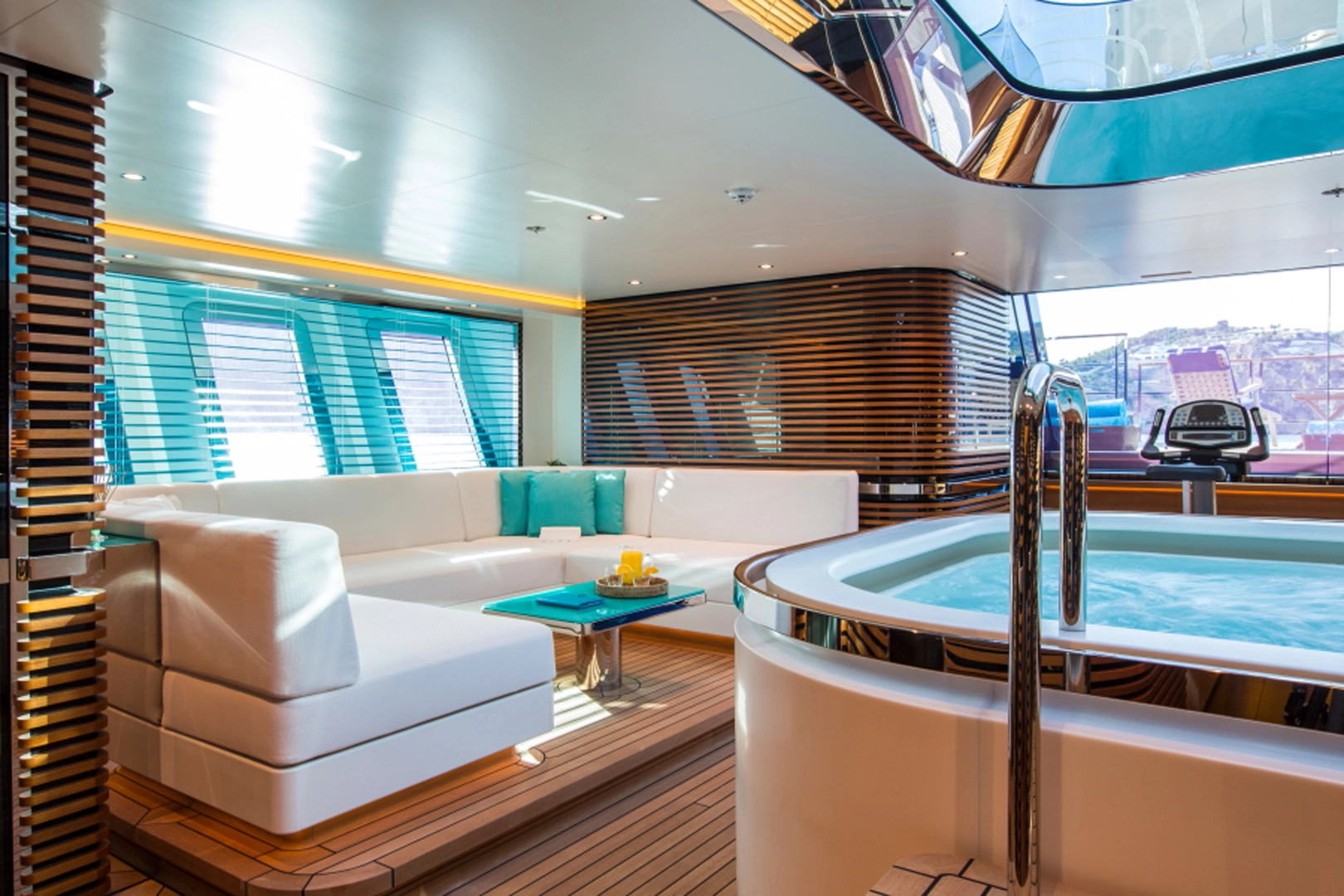 Khác với các du thuyền buồm thông thường, AquiJo tự hào khi sở hữu một beach club trong nhà rộng rãi với khu vực tiếp khách sang trọng. Có một giếng trời khổ lồ bao quanh jacizzi ở vị trí trung tâm. Ngoài ra, còn có phòng xông hơi khô và xông hơi ướt riêng biệt ẩn sau những chiếc cửa kính tinh tế.