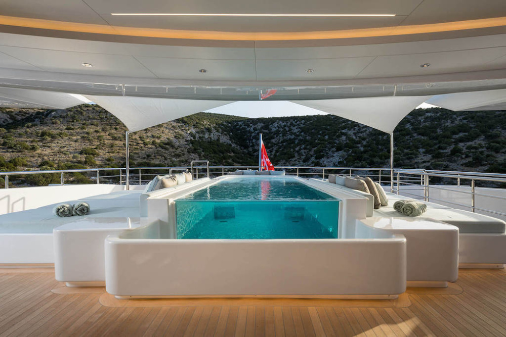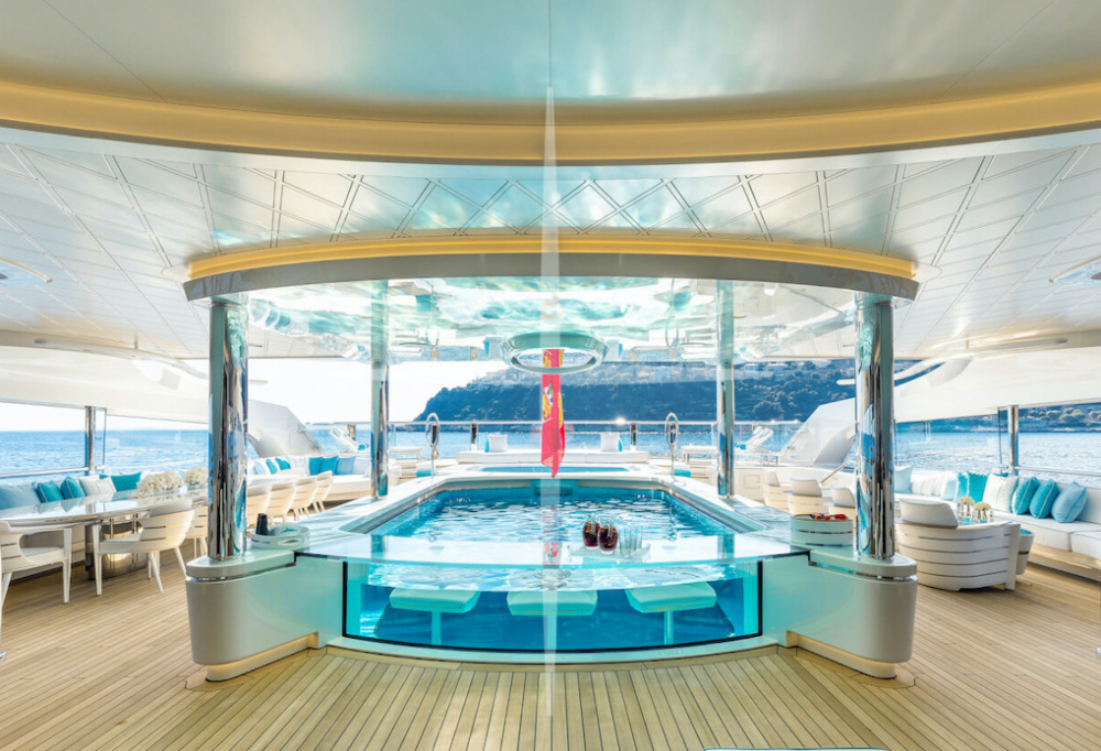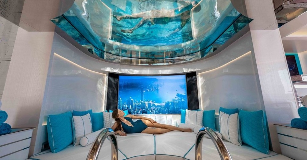 Ở boong trên, có một bể bơi đáy kính với ánh sáng xanh lấp lánh tuyệt đẹp liên thông với phòng khách bên dưới. Tại đây, bạn có thể thư giãn trên ghế sofa tròn sang trọng xung quanh bể ngâm trung tâm cùng với màn hình khổng lồ trên tường.