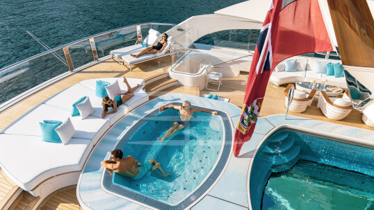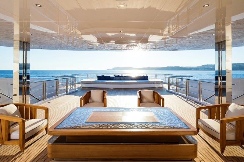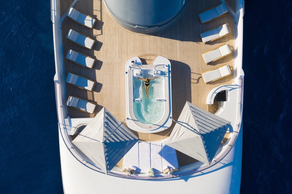 Không gian được phân chia với bầu trời và đại dương bởi những ô cửa sổ lớn màu lam ngọc. Tạo nên một không gian hấp dẫn, kích thích niềm vui. Các bậc thang tinh tế dẫn đến khu vực thư giãn ở boong sau với những chiếc ghế nằm thoải mái và một bệ bơi khác. Đây cũng là một nơi hoàn hảo để thư giãn, loại bỏ mệt mỏi và kiến tạo lại mọi thứ từ sức khoẻ đến tinh thần.